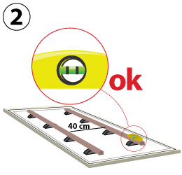 Instalación de los ristreles - Sobre una losa de hormigón : Fijar los ristreles sobre la losa dejando unos 40 cm de espacio entre las hileras. - Sobre un terreno natural : Los contactos de hormigón (350kg/m3) se colocan en intervalos regulares. Una vez esto efectuado, se continuará con la instalación de los ristreles sobre el hormigón fresco con el fin de sellarlas, dejar 40 cm de espacio entre las hileras y asegurarse de que cada hilera esté plana con la ayuda de un nivel de burbuja. |