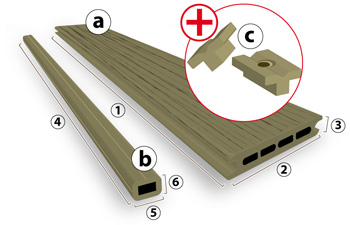 Dimensiones(a) Tablas de madera compuesta : 1- Longitud 400cm x 2- Anchura 14cm x 3- Altura 2cm (b) Ristreles madera compuesta : 4- Longitud 400cm x 5- Anchura 4cm x 6- Altura 3cm (c) Clips autoblocantes + tornillo acero inoxidable Acondicionamientos