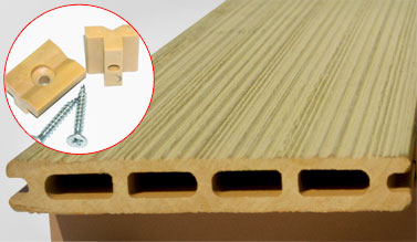 Vista de las tablas Las láminas de madera compuesta son vaciadas con el fin de permitir una mayor facilidad de montaje de su playa de piscina (atornillar, cortar, perforar...). Las láminas se fijan a los ristreles a través de unos sólidos clips de fijación, discretos y estéticos que tienen el mismo color de las tablas. Las caras de los ristreles están achaflanadas con el fin de centrar y alinear la instalación de los tornillos. Esta técnica facilita la instalación y evita un marcado impreciso, fuente de errores. |